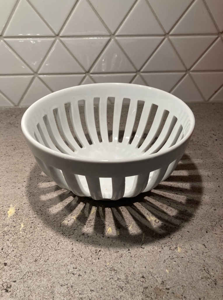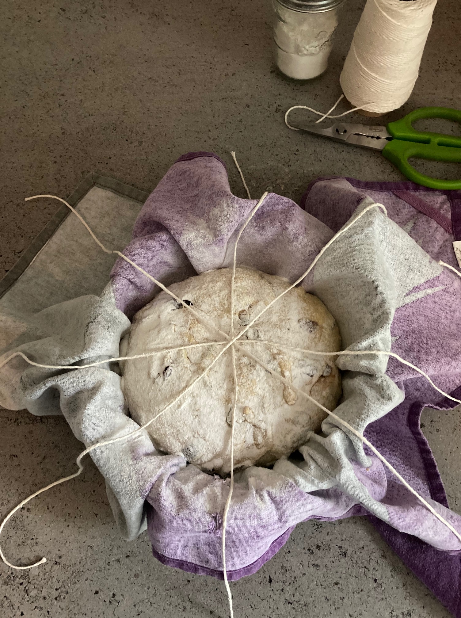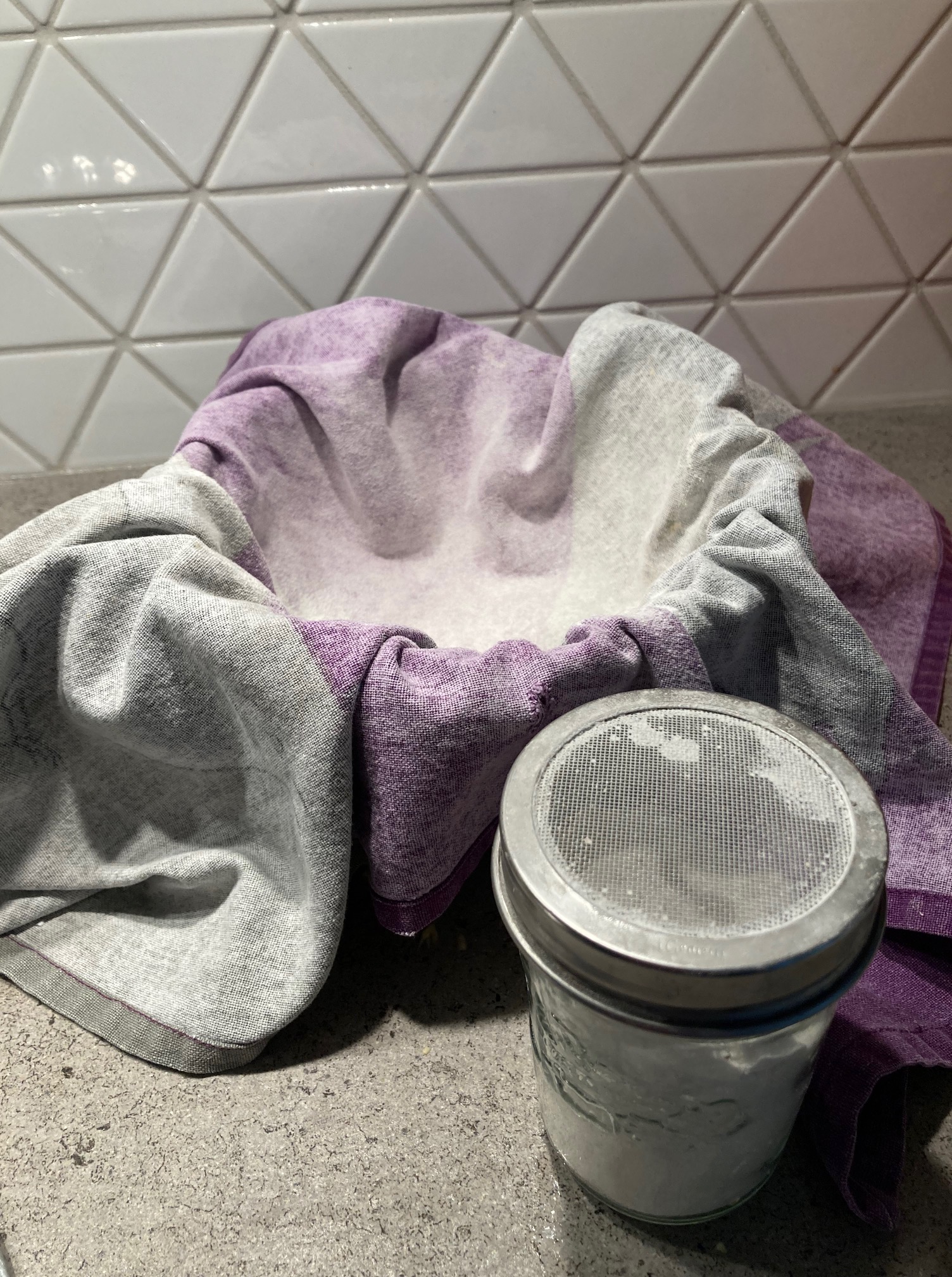 Retourner la pâte et la déposer, coté du dessus au fond) dans un banneton de 7 à 8 po de diamètre. À défaut d’un banneton, on peut utiliser un autre contenant de la forme approximative d’une demi-sphère. Dans ce cas, on le recouvre d’un linge qu’on saupoudre ensuite de farine. J’utilise de la farine de riz pour un meilleur contraste de couleur. Bien couvrir et laisser reposer 30 minutes.