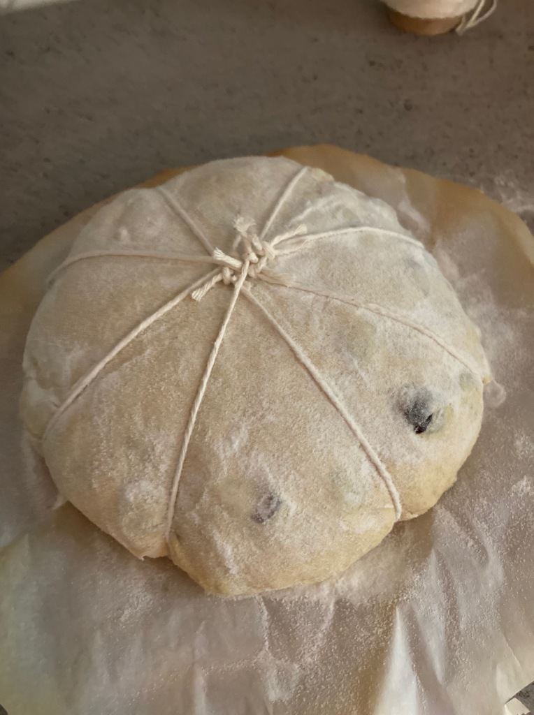 Une fois la température voulue du four atteinte, déposer 4 ficelles sur le dessous exposé du pain de manière à former une étoile qui formera les côtes de la citrouille. Déposer dessus un papier parchemin puis une planche à découper pour retourner la pâte délicatement. Enlever le moule puis le linge. Ajouter de la farine au besoin pour recouvrir tout le pain. Nouer les ficelles (pas serré) pour former la citrouille et couper les bouts de ficelles.