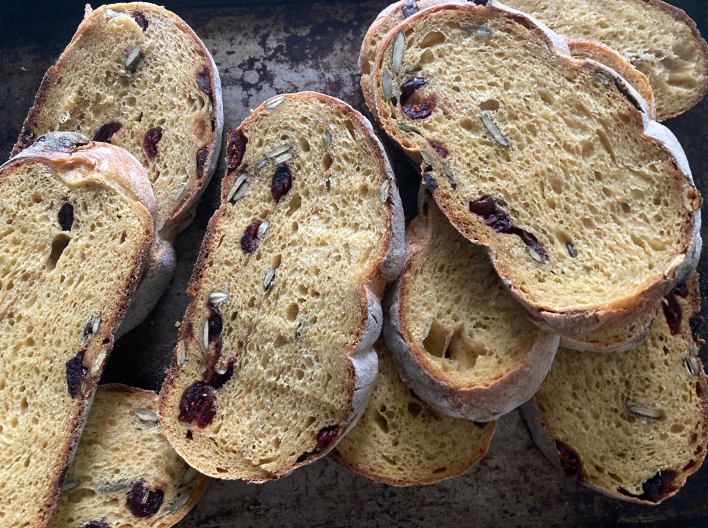 Ce n’est pas moi qui ai le mérite d’avoir inventé la méthode pour former un pain aussi spectaculaire, mais je suis ravie de la partager d’autant plus qu’elle est facile à réaliser. N’empêche que je me suis sentie inspirée pour créer une recette bien à moi. Bien sûr, on y retrouve de la chair de citrouille, et pas en quantité subliminale. Et aussi bien entendu des graines de citrouille (sans écales, évidemment quoique je reviendrai un jour avec un pain fait avec des graines de citrouille avec écales réduites en poudre). Pour rester dans le domaine du local, j’ai utilisé des farines dont les grains sont cultivés au Québec et la farine de seigle figure parmi celles-ci. J’aurais pu me contenter du blé et de l’épeautre que j’adore mais c’était trop tentant d’ajouter du seigle vu que cette céréale est cultivée aux cotés de la citrouille à la ferme innovatrice de l’Odyssée et ce, dans un contexte de culture régénératrice; elle sert notamment de paillis naturel à des citrouilles à graines nues cultivées sur une grande échelle (une première au Québec et ça vaut la peine de le souligner et d’encourager ceux qui participent à cette aventure prometteuse). Qui plus est, la variété est l’un des piliers d’une alimentation équilibrée et ça s’adonne que le plaisir des papilles est au rendez-vous. En plus, alors que la récolte des canneberges se termine, j’ai aussi trouvé intéressant d’y ajouter ce petit fruit rouge acidulé qui offre un savoureux contrepoint. Quant à la cannelle, j’en fais comme d’habitude un usage parcimonieux, juste assez pour sublimer les saveurs et faire un lien avec le bâton bien dressé qui sert de pédoncule à ma sculpture à 99,9% comestible.