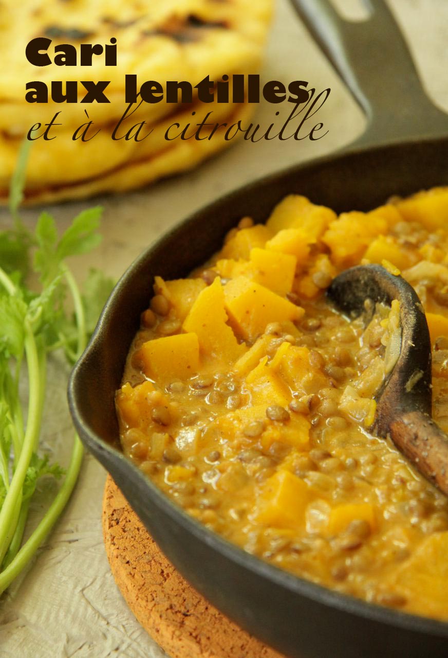 Pendant les mois d’hiver et jusqu’au printemps, je prépare exclusivement des mets citrouillés à partir de purée car la congélation de cubes de citrouille ne donne pas d’assez bons résultats à mon goût. Donc quand vient le temps de l’Halloween, j’en profite pour cuisiner des mets avec des morceaux de citrouille comme ce cari (un vraie petite merveille avec du pain naan ou du riz basmati!). C’est un peu plus de trouble parce qu’en plus d’évider la citrouille, il faut la peler et la couper; genre d’activité à éviter un soir de semaine. Mais tant qu’à moi ça vaut le coup car c’est bien agréable aussi de sentir la texture de la citrouille lorsqu’on la mange. Donc pourquoi pas préparer ce mets indien le week-end et le servir le lundi. D’ailleurs, je trouve que ce cari gagne, au niveau des saveurs, à être préparé d’avance – comme plusieurs plats mijotés. En passant, je vous recommande de cuire vous même vos lentilles pendant que vous préparez la citrouille, ça ne vous demandera pas tellement plus de temps que d’ouvrir une boîte de conserve et ce sera à la fois meilleur et moins cher. Si en plus vous en cuisinez un surplus à congeler pour d’autres éventualités (soupes, sauce à spahetti, hummus, etc.), je commence à appeler ça de l’organisation!