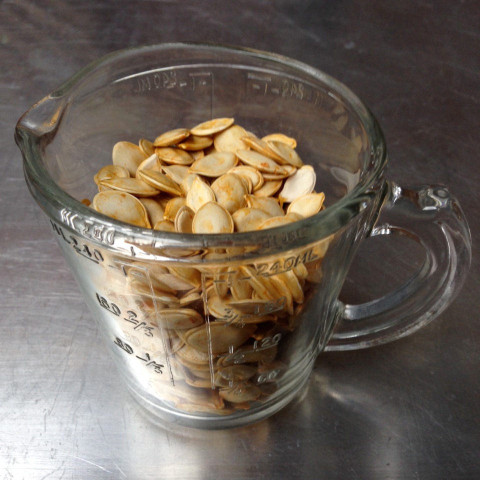 La citrouille de 2,4 kg (5 lbs) a donné 2 litres (8 tasses) d’une purée dense, exquise et d’une belle couleur orangée ainsi qu’environ 180 ml (3/4 tasse) de graines de citrouille.